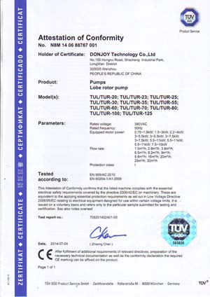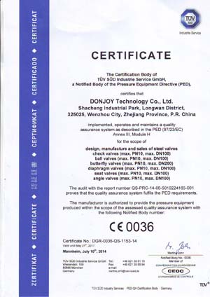 东正由德国TÜV机构实施的欧盟承压设备指令(PED-97/23/EC)和(MD-06/42/EC)认证 质量保证模式H&材料(管件)制造认证,机械安全指令MD-06/42/EC。 阀门类证书 NO.CE 0036 泵类证书 NO.705201402401-00